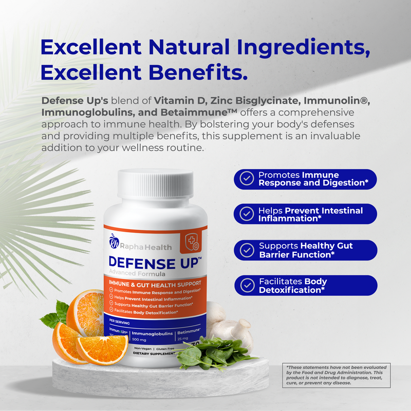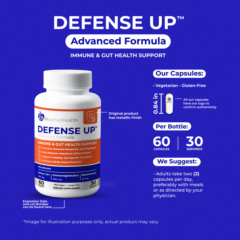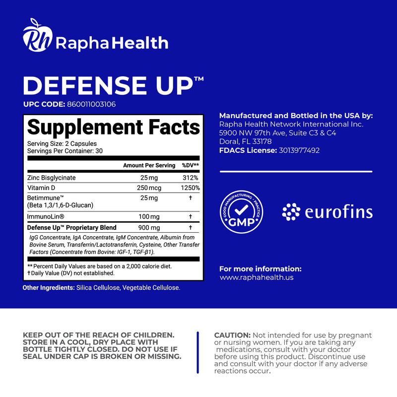 Elevate your immune health with Defense Up, the premium supplement designed to strengthen your body's natural defenses. Our formula includes key immune-supporting ingredients such as Zinc and Vitamin D, combined with the power of ImmunoLin®, a specialized blend that enhances immune response. Defense Up is rich in immunoglobulins and bioactive proteins, including IgG, IgA, IgM, IgE, and IgD, plus additional transfer factors for comprehensive immune support. Whether you're looking to maintain optimal health or bolster your immune system, Defense Up offers a potent blend of nutrients to help you stay protected.